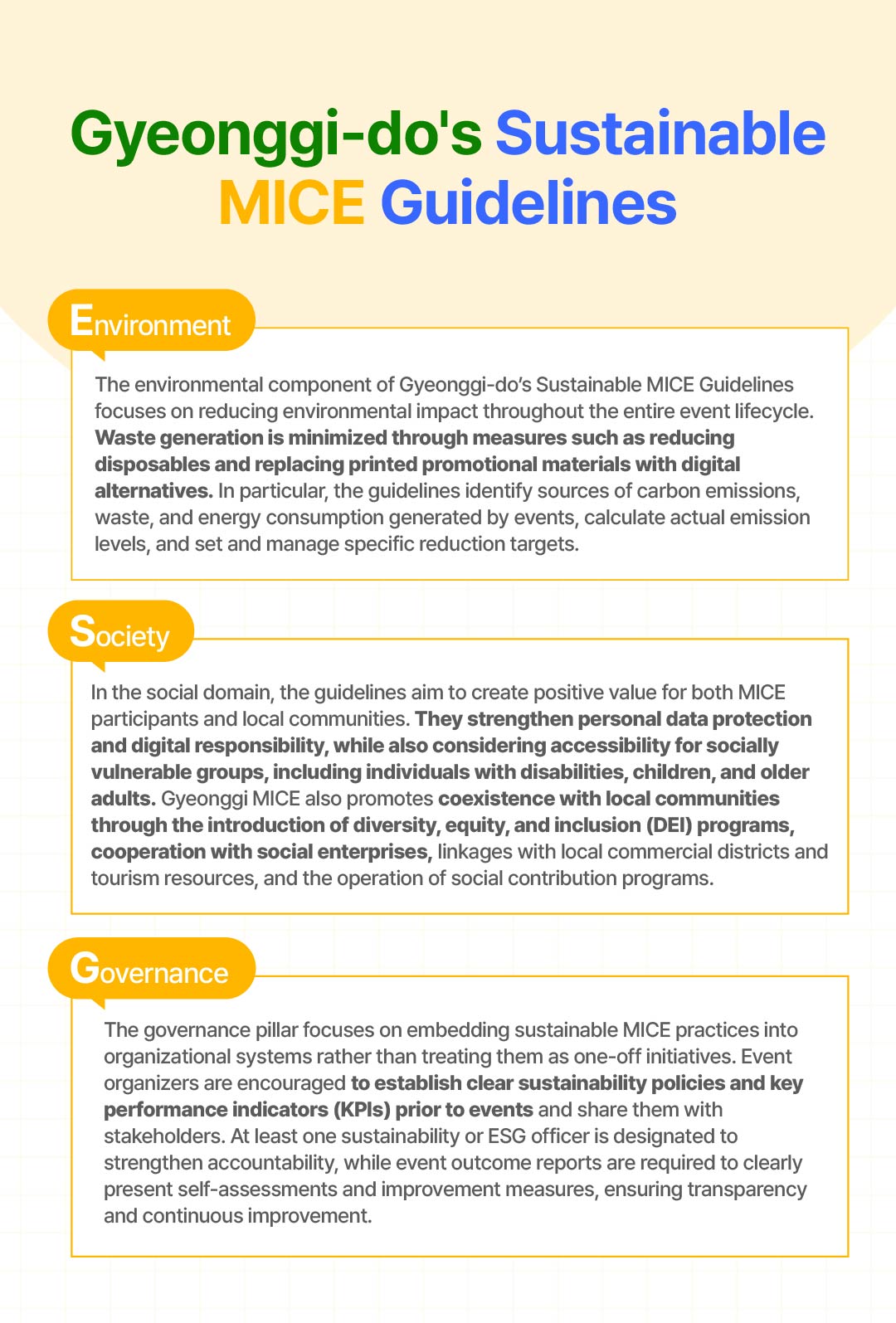 ESG refers to Environment, Social, and Governance factors, which are key criteria for assessing the sustainability of industries. To apply these principles to the MICE sector, Gyeonggi-do structured the guidelines around the following three pillars.